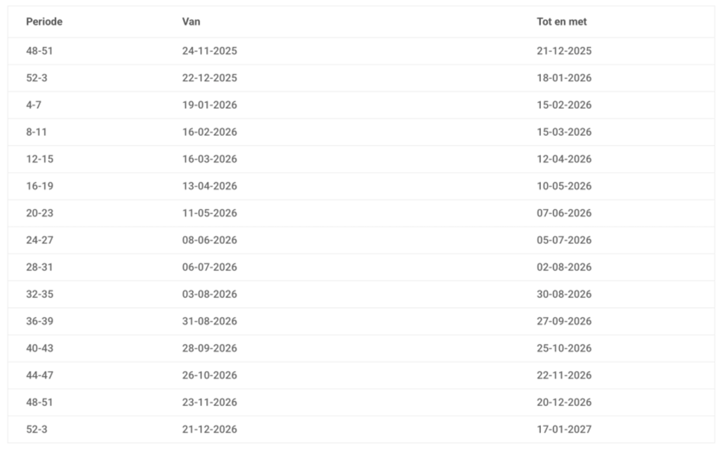 De huur wordt na vaste 4-wekelijkse termijnen afgeschreven. Iedere 2 weken is er de mogelijkheid om in te stappen. Voorbeeld: Als je op op 5 januari 2026 je goederen wilt opslaan bij ons, dan kun je vanaf 2 januari 2026 de ruimte huren. Je huurt dus nooit langer dan 2 weken ‘ongebruikt’. De actuele huurperiodes en incassodata.